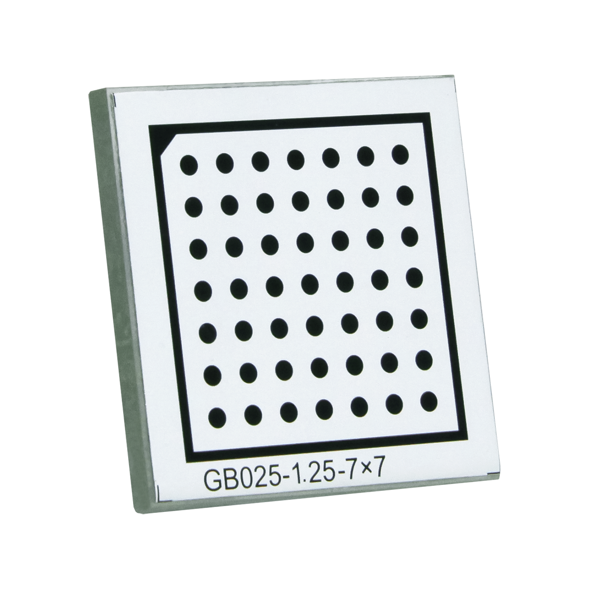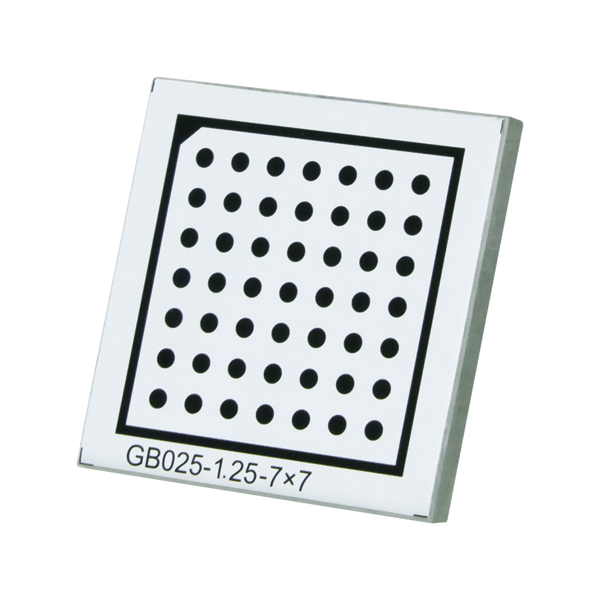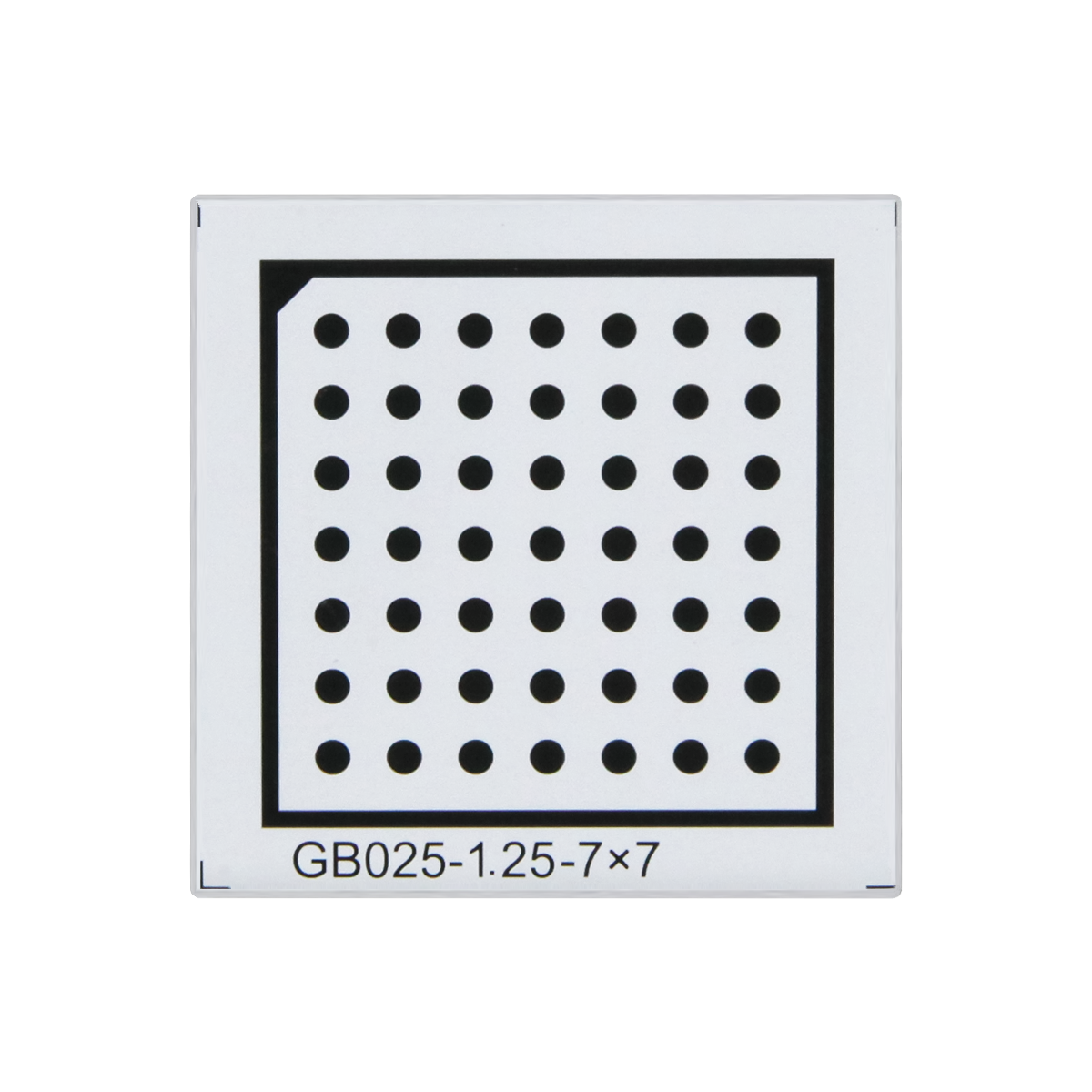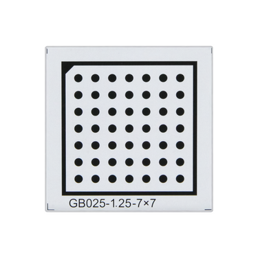 25x25mm. Effective Area: 20x20mm. Marker Spacing: 2.5mm. Dot Diameter: Dia. 1.25mm. Array Specification: 7x7. Substrate Material: Acrylic (PMMA). Panel Material: Alumina. Manufacturing Precision: ±10μm.