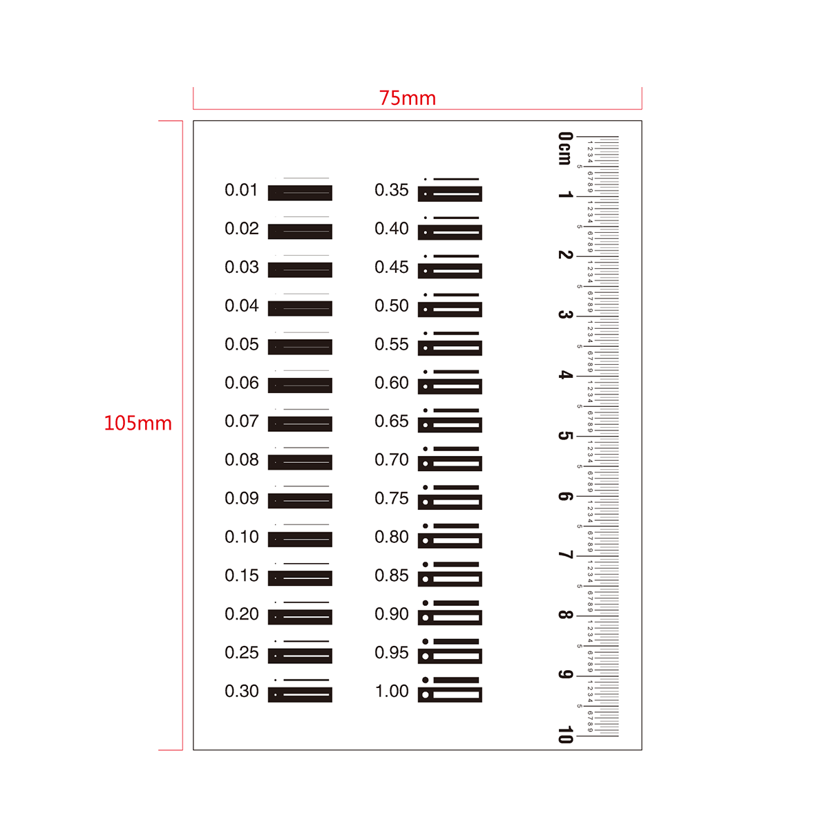 100mm/200 Div. Comparison Test Gauge. Film Ruler Dimensions: 105x75x0.1mm. Line Length (Width): W: 0.01-1.00mm.