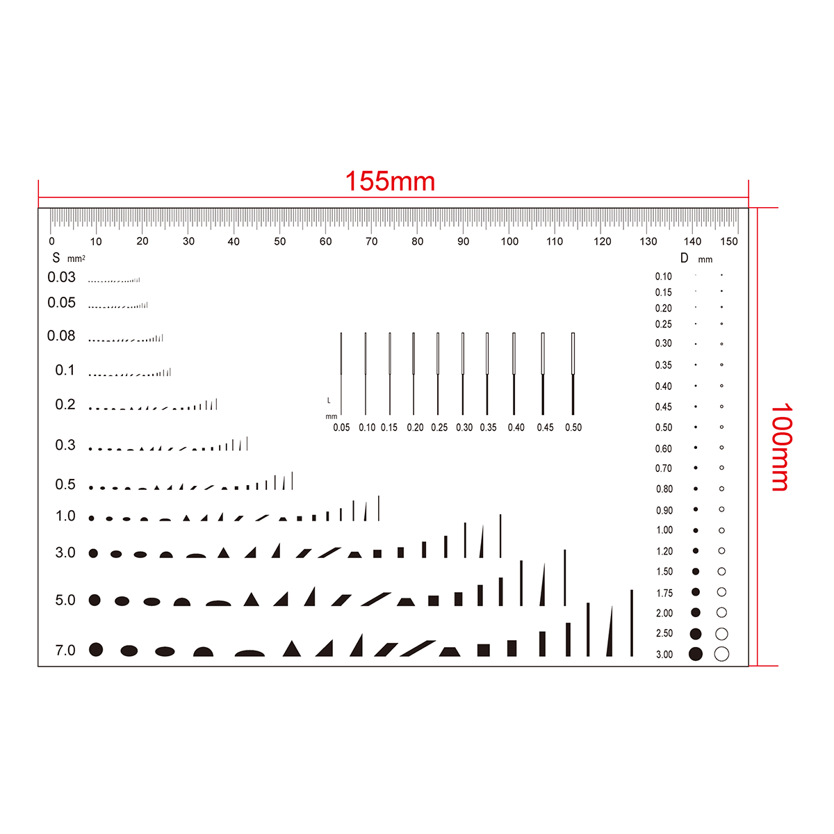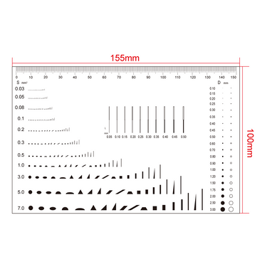 150mm/300 Div. Multi-Function Film Ruler . Film Ruler Dimensions: 155x100x0.1mm. Line Length (Width): W: 0.05-0.50mm. Diameters Range: Dia. 0.1-3.0mm. Area Measurement Type: 18 Species. Area Measurement Range: 0.03-7.0mm².