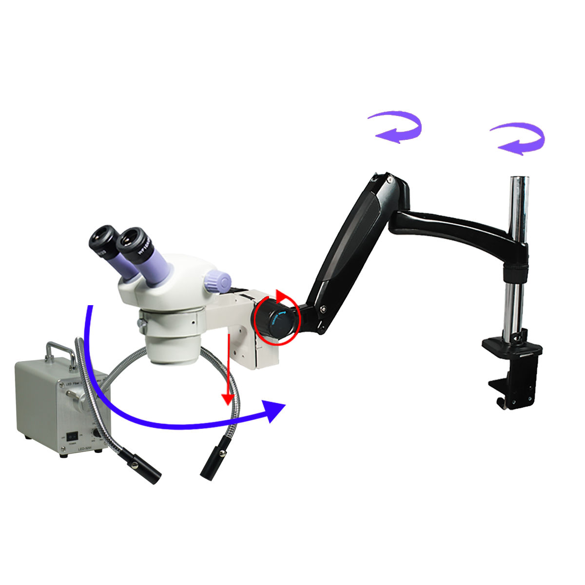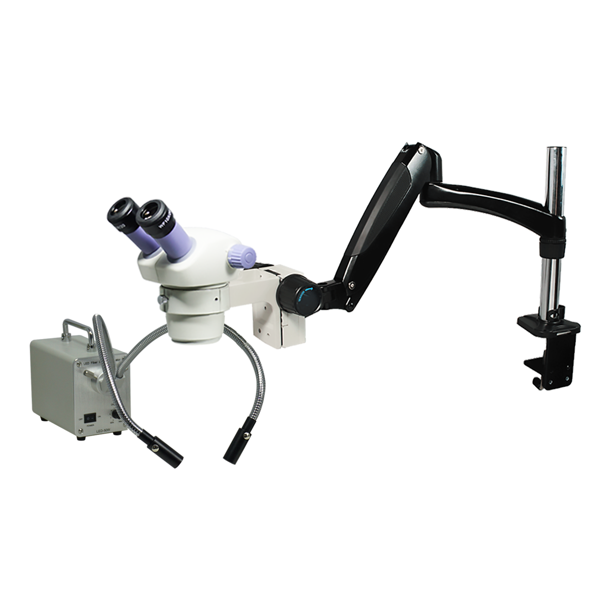 Finite. Total Magnification: 7-30X. 10X Adjustable Eyepiece. 1X Built-in Objective. Zoom Ratio: 1:4.3. Binocular. Body Mounting Size for Stand: Dia. 76mm. Eye Tube Angle: 45°. Eyepiece Field of View: Dia. 20mm. Pneumatic Arm. Total Arm Length: 600mm. LED Light. Light Adjustable. Gooseneck Dual Pipe Light . Input Voltage: AC 100-240V 50/60Hz.