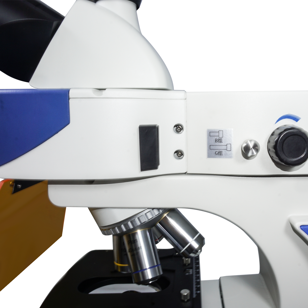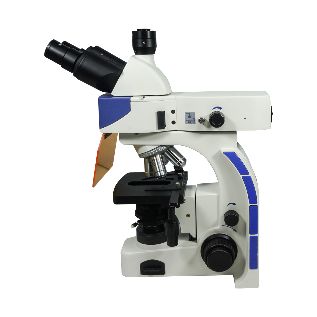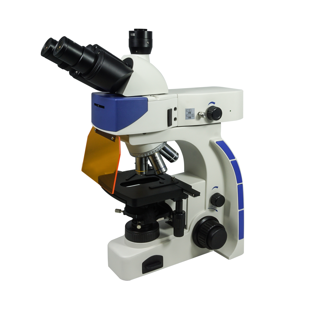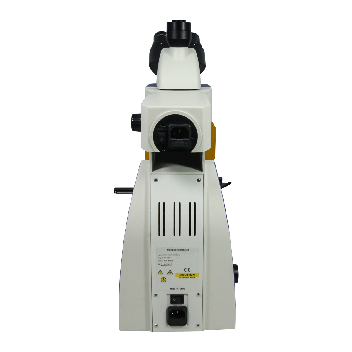Infinite. Total Magnification: 40-1000X. 10X High Eyepoint Eyepiece. 4X 10X 40X 100X Infinity Plan Achromatic Objective. Standard Coupler: 0.5X. Eye Tube Angle: 30°. Eyepiece Field of View: Dia. 20mm. XY Stage Travel Distance: 75x50mm. Illumination Type: LED Coaxial Transmitted Light. LED. Excitation Filter Type: B G. Input Voltage: AC 100-240V 50/60Hz.