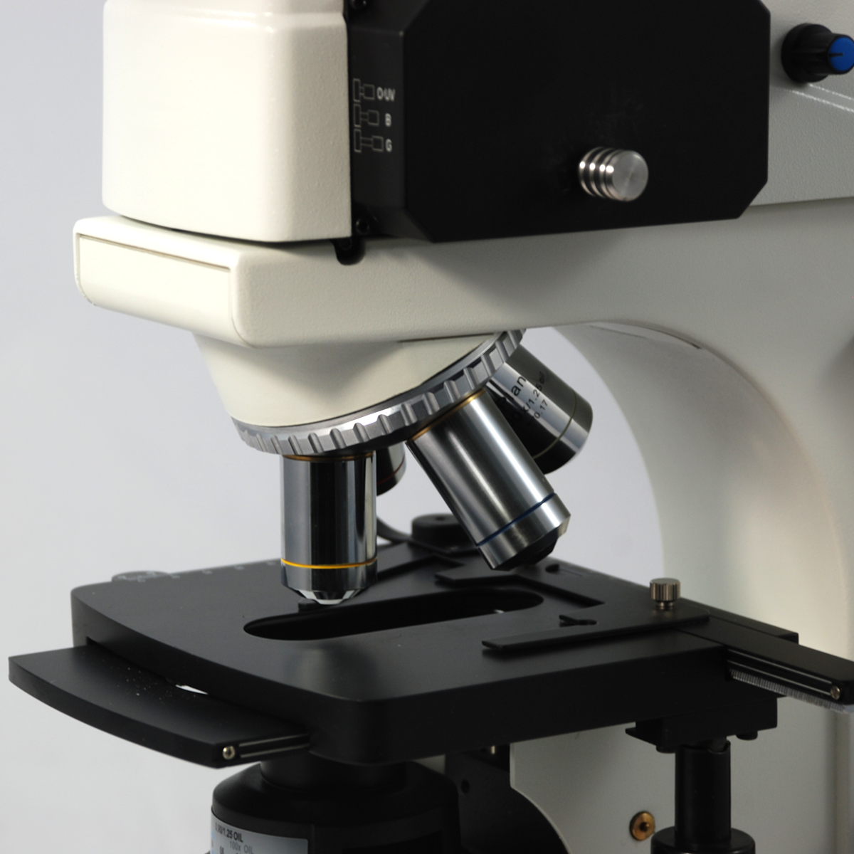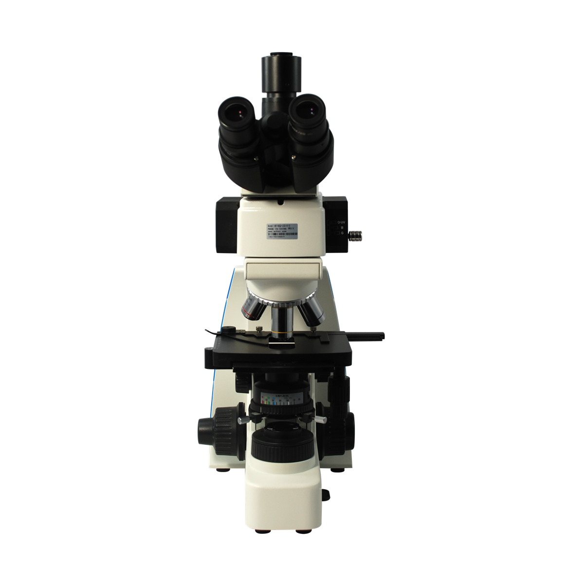 Infinite. Total Magnification: 40-1000X. 10X High Eyepoint Eyepiece. 4X 10X 40X 100X Infinity Plan Achromatic Objective. Standard Coupler: 1X. Eye Tube Angle: 30°. Eyepiece Field of View: Dia. 20mm. XY Stage Travel Distance: 75x50mm. Illumination Type: Halogen Transmitted Light. LED. Excitation Filter Type: B G UV. Input Voltage: AC 80-240V 50/60Hz. Input Voltage: AC 100-240V 50/60Hz.