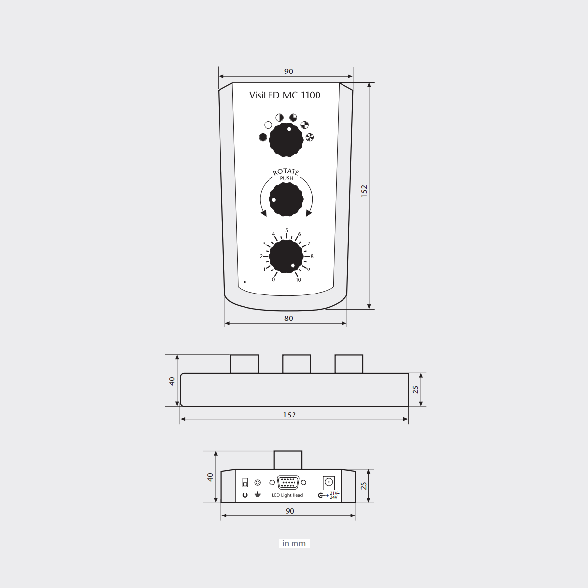 Light Adjustable. 8 Zones for 6 Sets of Combination. For Brightfield Ring Light, SCHOTT-Visi-400.110, SCHOTT-Visi-400.150, SCHOTT-Visi-400.200, SCHOTT-Visi-400.225, SCHOTT-Visi-400.255, SCHOTT-Visi-400.266, For Darkfield Ring Light, SCHOTT-Visi-400.300, Back Lights SCHOTT-Visi-400.350 and SCHOTT-Visi-400.400. SAP 1740403.