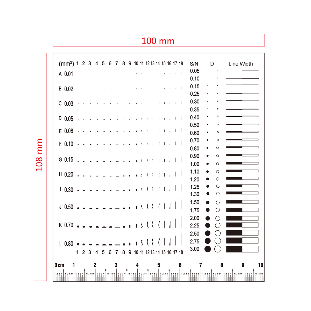 100mm/200 Div. Multi-Function Film Ruler . Film Ruler Dimensions: 108x100x0.1mm. Line Length (Width): W: 0.05-3.0mm. Diameters Range: Dia. 0.05-3.00mm. Area Measurement Type: 18 Species. Area Measurement Range: 0.01-0.80mm².