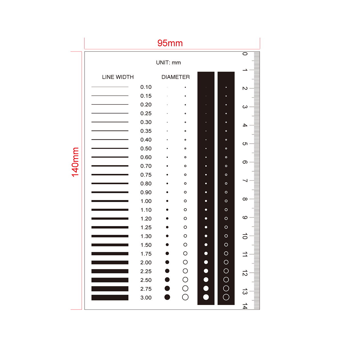 140mm/280 Div. Multi-Function Film Ruler . Film Ruler Dimensions: 140x95x0.1mm. Line Length (Width): W: 0.1-3.0mm. Diameters Range: Dia. 0.1-3.0mm.