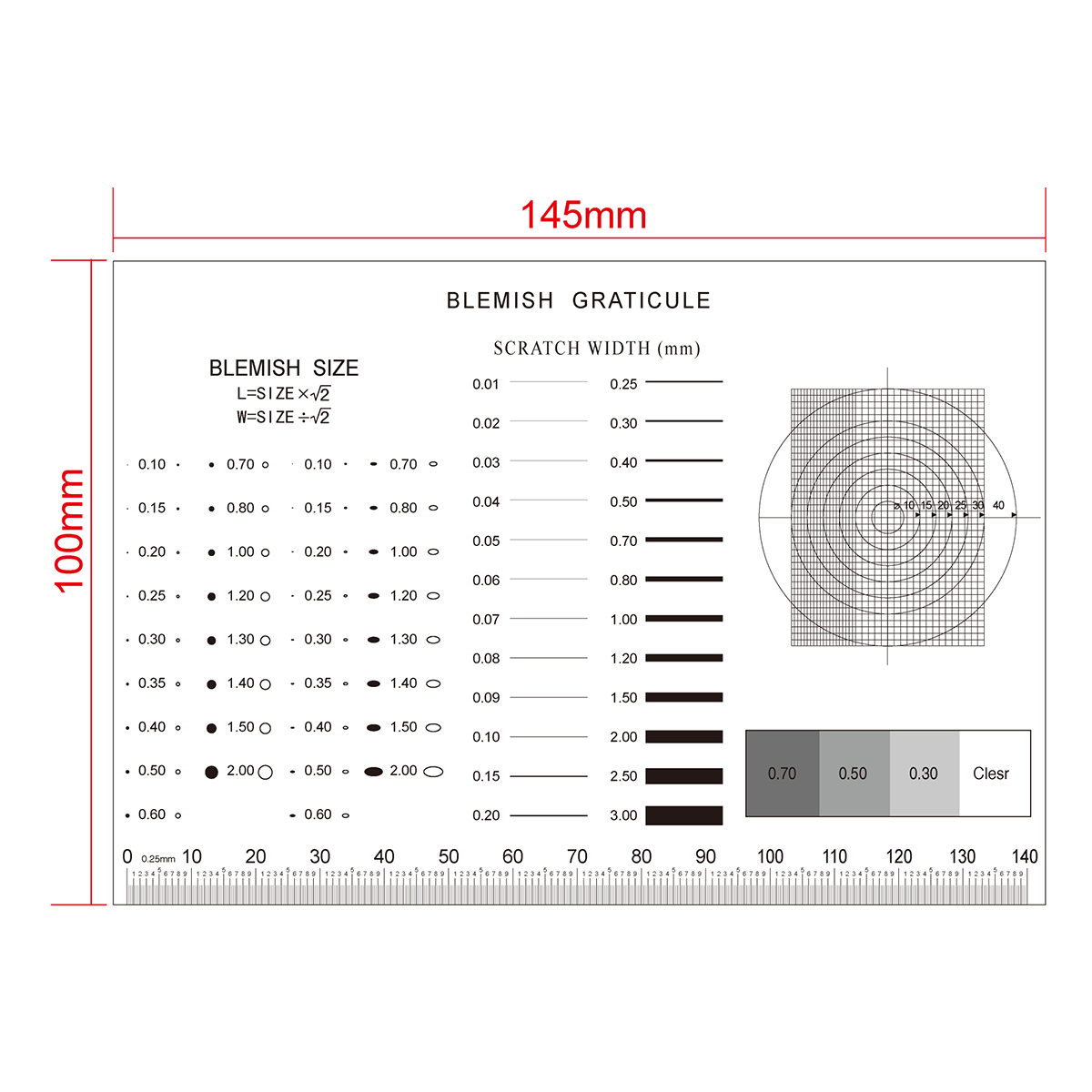 140mm/560 Div. Multi-Function Film Ruler . Film Ruler Dimensions: 145x100x0.1mm. Line Length (Width): W: 0.01-3.00mm. Diameters Range: Dia. 10-40mm. Gray Scale Measurement: 0%-70%.