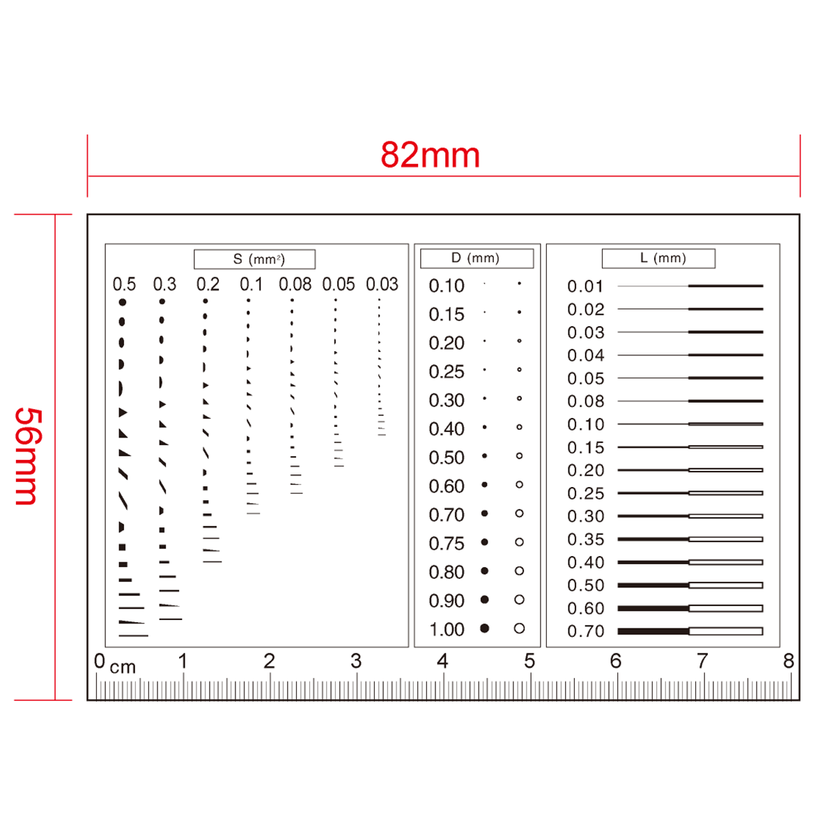 80mm/160 Div. Multi-Function Film Ruler . Film Ruler Dimensions: 82x56x0.1mm. Line Length (Width): W: 0.01-0.70mm. Diameters Range: Dia. 0.1-1.0mm. Area Measurement Type: 18 Species. Area Measurement Range: 0.03-0.5mm².