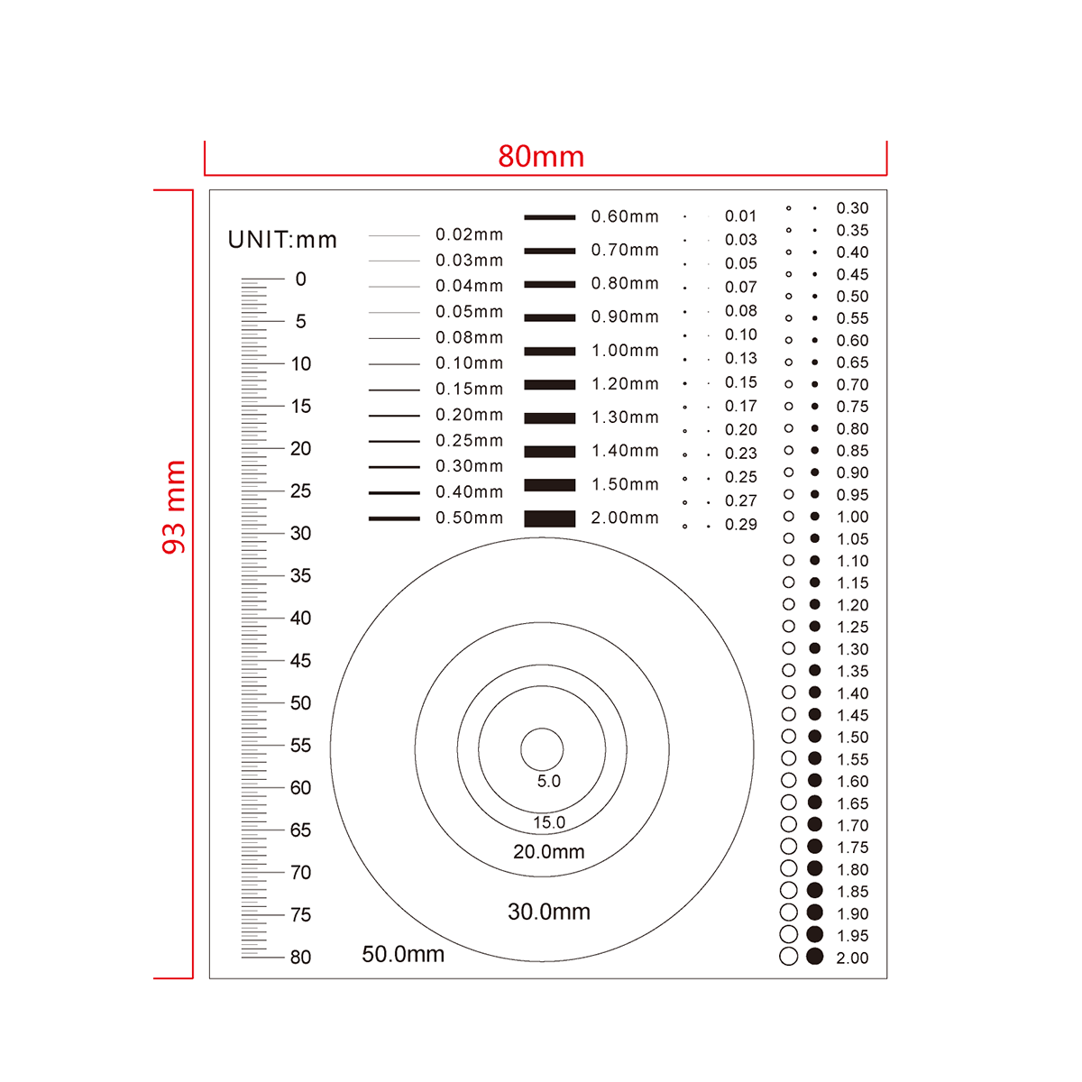 80mm/160 Div. Multi-Function Film Ruler . Film Ruler Dimensions: 93x80x0.1mm. Line Length (Width): W: 0.02-2.00mm. Diameters Range: Dia. 0.01-50.0mm.