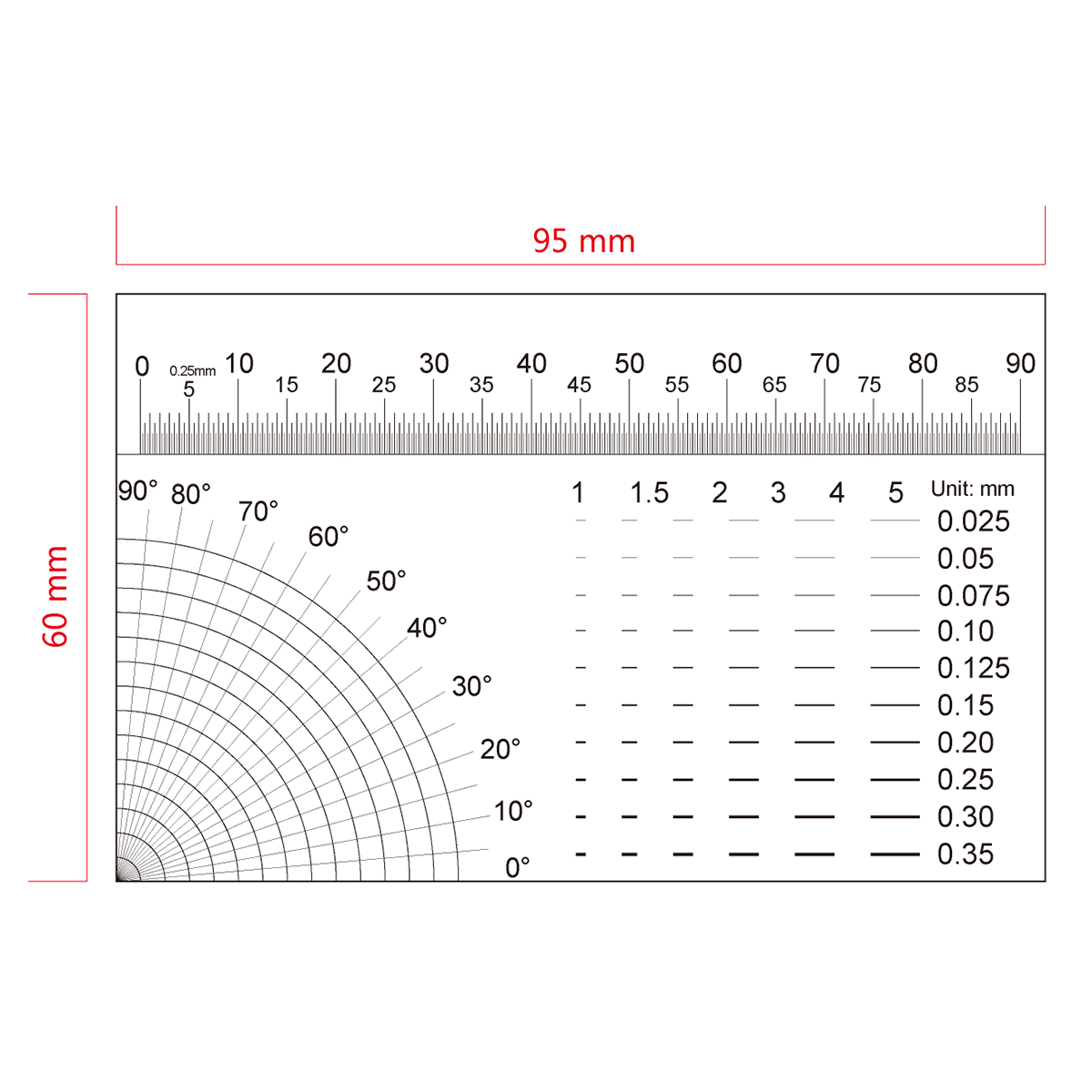 90mm/360 Div. Multi-Function Film Ruler . Film Ruler Dimensions: 95x60x0.1mm. Line Length (Width): L: 1-5mm, W: 0.025-0.35mm. 0-90°.